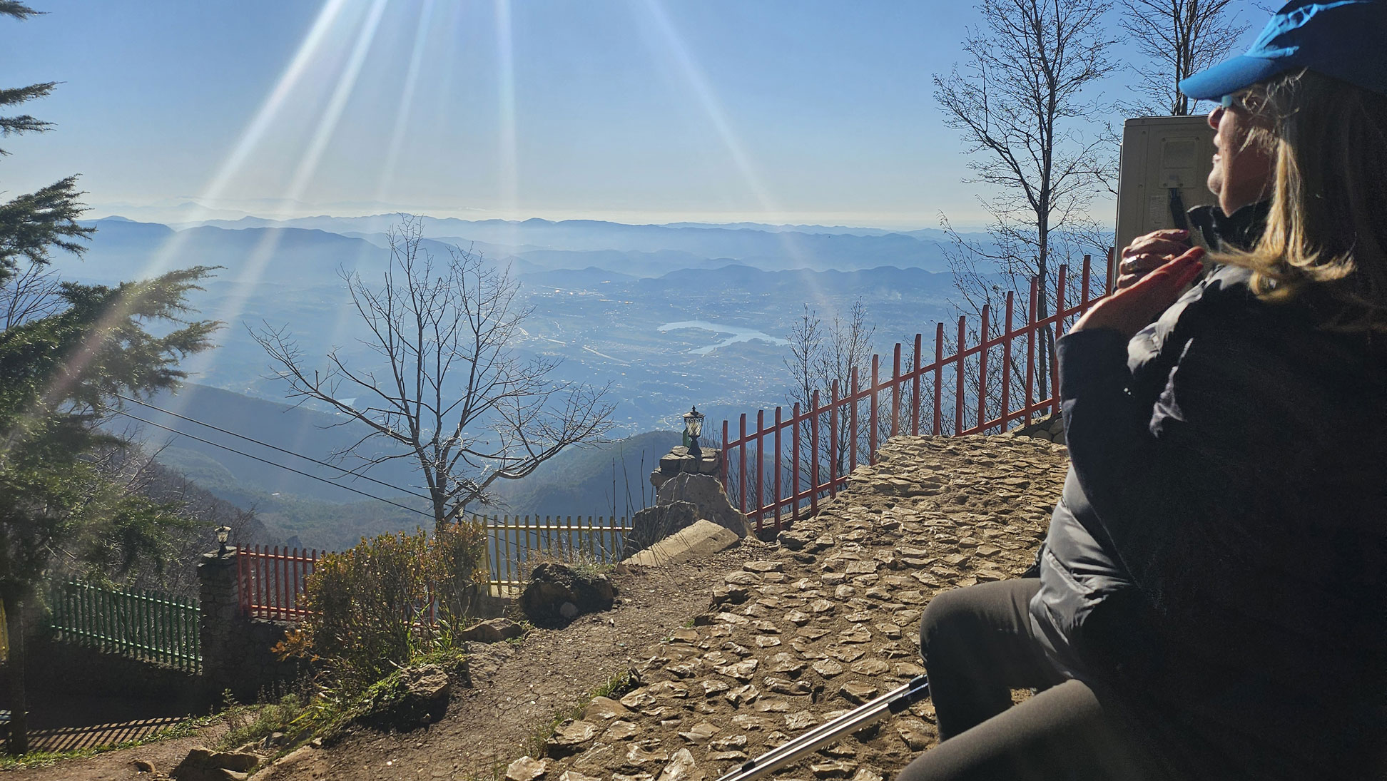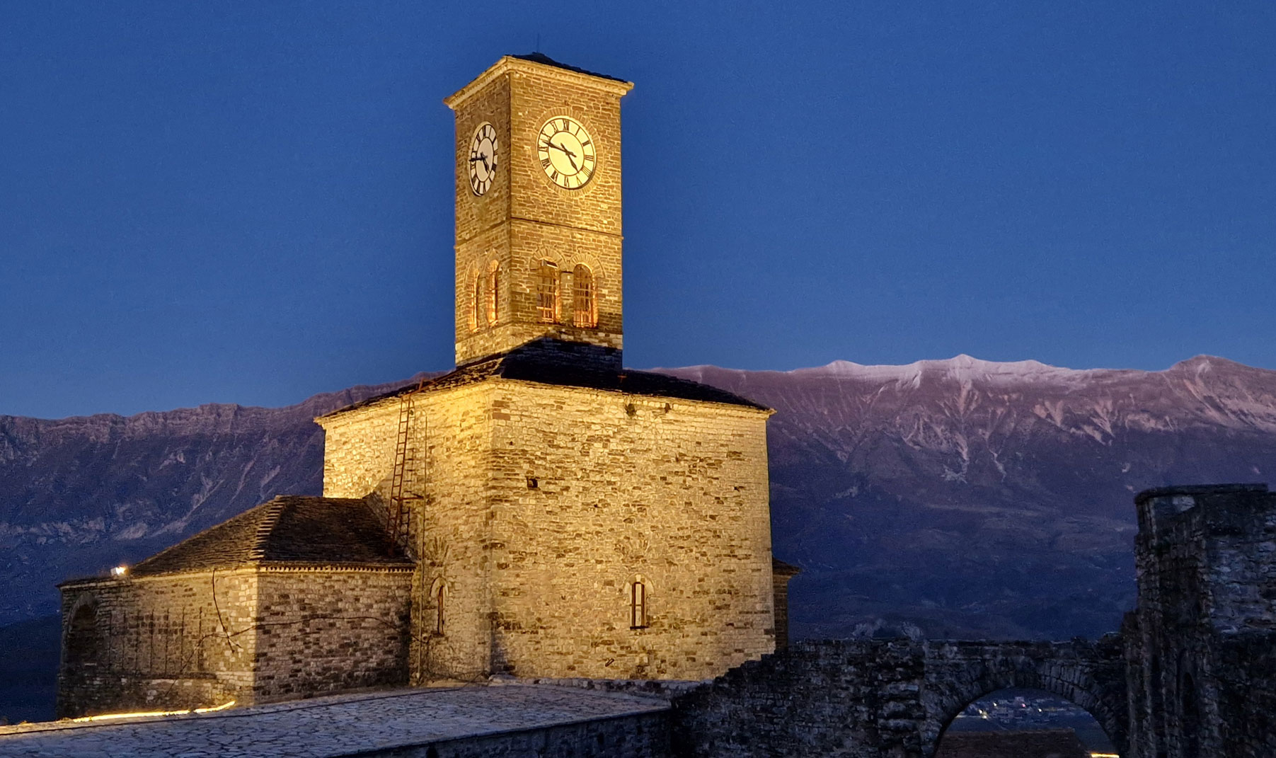 Desde el castillo, la vista hacia el este muestra la masa inmensa del Tomorr cambiando de color según la hora: azul profundo al amanecer, plateado al mediodía, púrpura al atardecer.