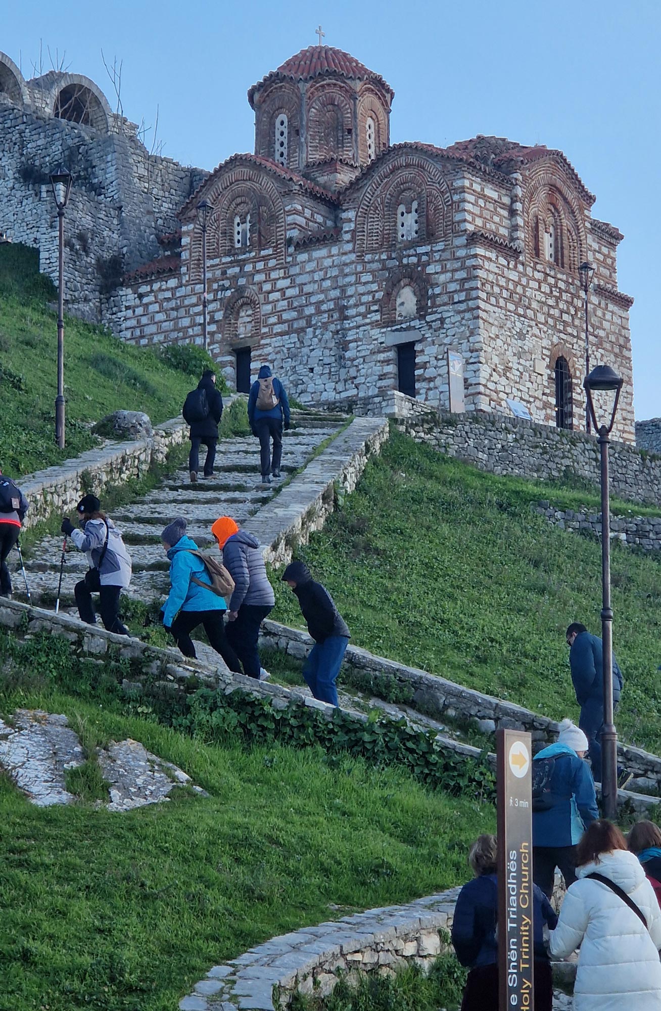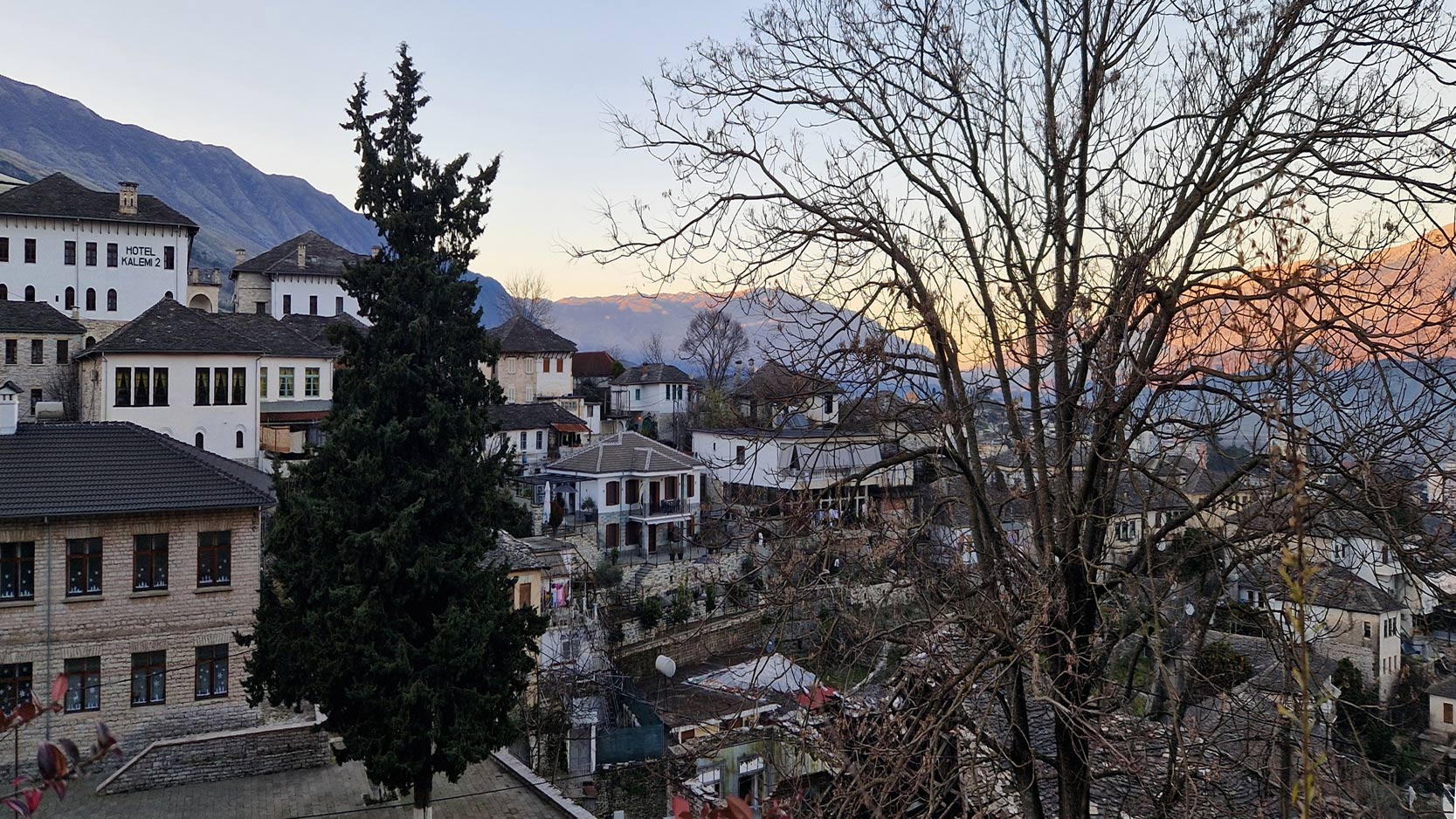 Del vuelta a Berat, por la tarde tenemos tiempo libre y nos vamos a pasear al barrio de Mangalem, que es el corazón visual y emocional de Berat, el barrio que define la famosa “ciudad de las mil ventanas”. Toda su estructura parece un anfiteatro natural: casas blancas escalonadas en la ladera, ventanas alineadas como si miraran al valle del Osum, callejuelas empedradas que serpentean entre muros antiguos y una atmósfera que conserva intacto el espíritu otomano.