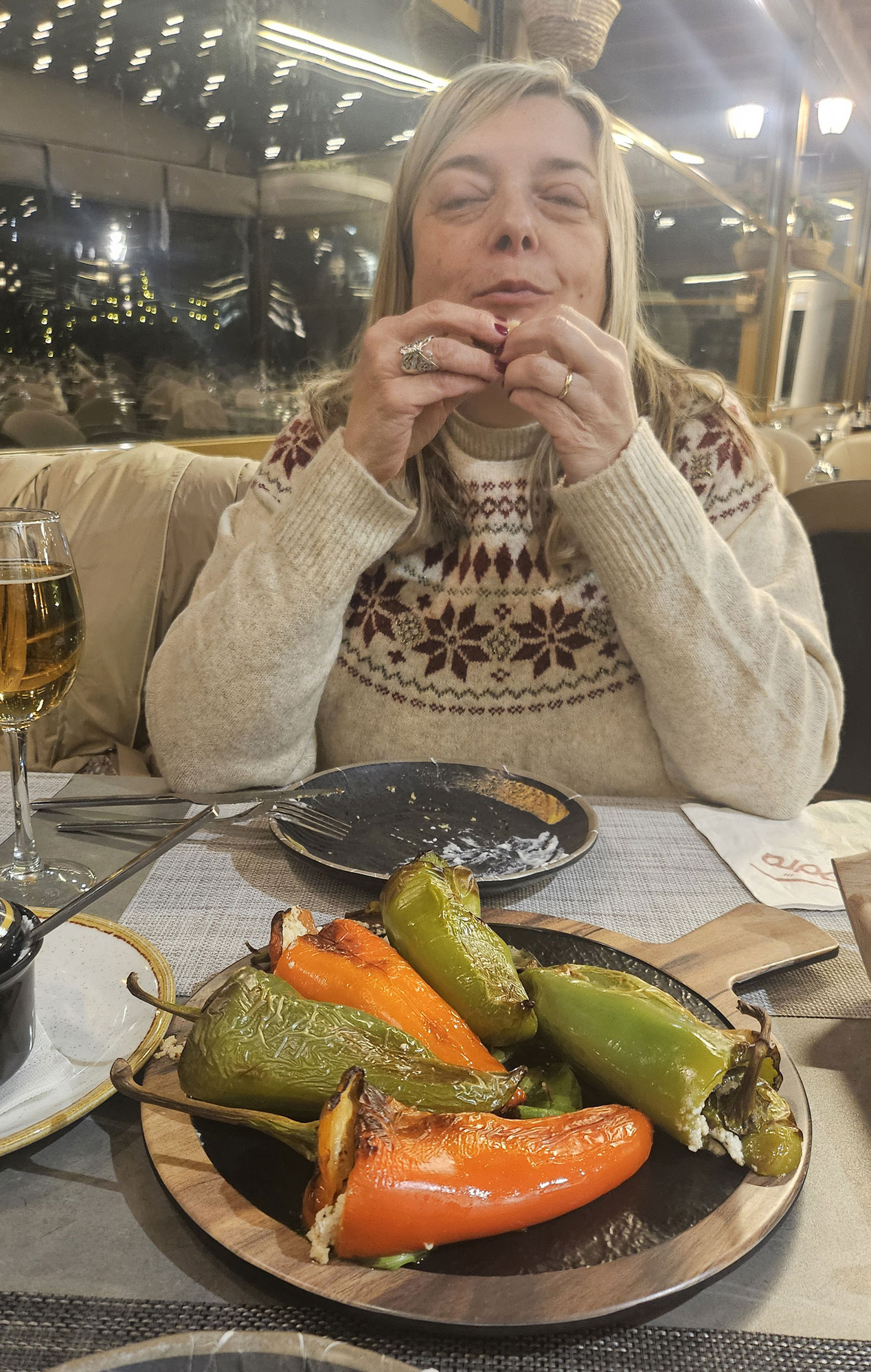 Nos preparamos para el fin de año, estamos en el "hotel Colombo", la cena es abundante pero no muy buena, somos casi 200 personas en distintas mesas y la comida es como de cuartel, además hay un disc jockey, que tiene la música a tope y se es bastante molesto, nosotros cenamos y nos vamos a dormir pronto.