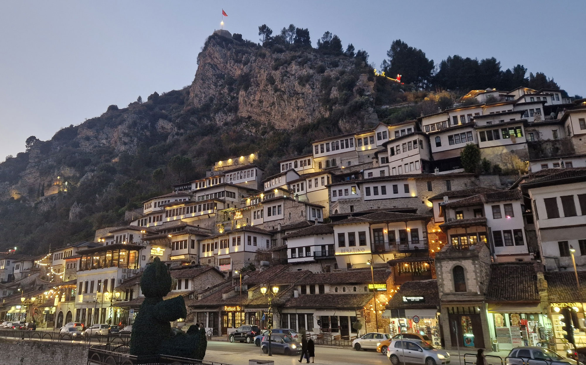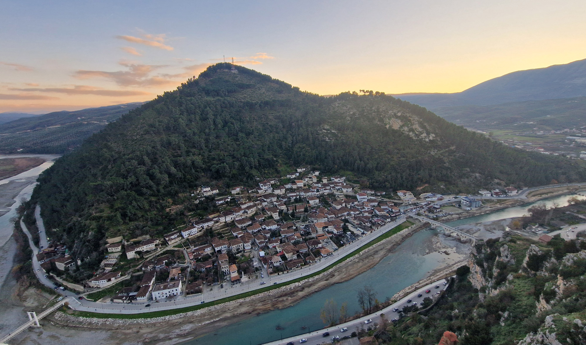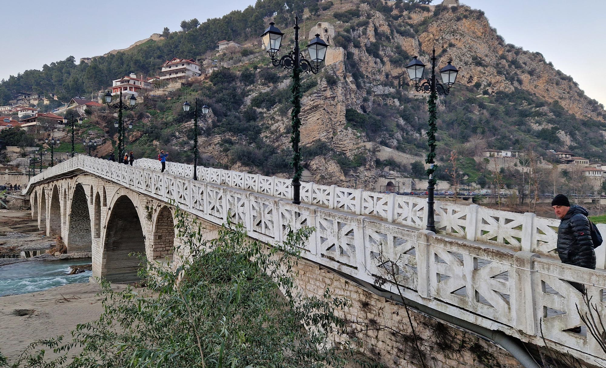 Muchos viajeros lo consideran uno de los mejores lugares para contemplar Berat al atardecer, cuando los arcos se tiñen de dorado y el río refleja la luz como un espejo antiguo .