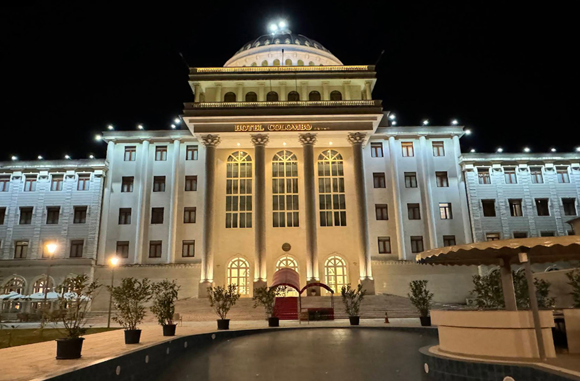 El Hotel Colombo de Berat se presenta como un gran palacio moderno levantado a la entrada de la ciudad, un edificio amplio y luminoso que destaca por su escala y por una estética que mezcla mármol, columnas y espacios abiertos. Desde fuera ya transmite la sensación de ser un hotel pensado para impresionar, y al entrar se confirma: un vestíbulo enorme, techos altos, superficies brillantes y una atmósfera que combina lujo accesible con un cierto aire ceremonial.
