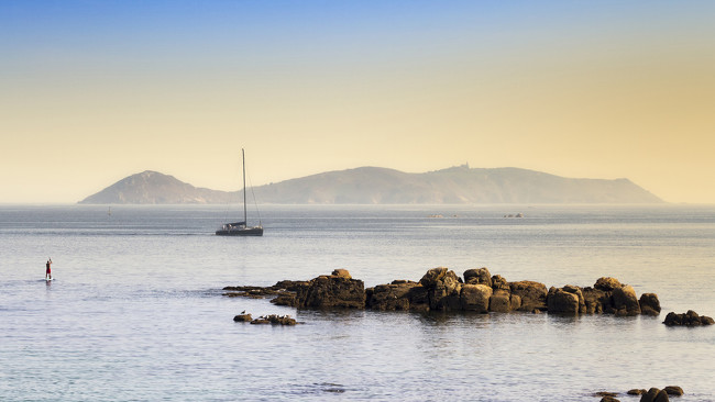 En la boca de la ría, a modo de nave pétrea varada en el océano, se encuentran las famosas islas Cíes, uno de los paisajes más bellos de Galicia y buque insignia del Parque Nacional de las Islas Atlánticas.