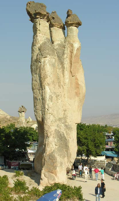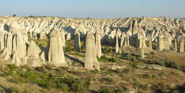 Los grandes volcanes Erciyes y Hasan hace millones años cubrieron la zona con la lavas. La toba, o bien la piedra caliza de 150 metros de espesor, desde hace millones de años se talla por medio del viento, la lluvia, el calor y el frío. Así que la naturaleza nos regala unas obras de roca con la forma cónica que los campesinos las llaman como chimeneas de hadas.