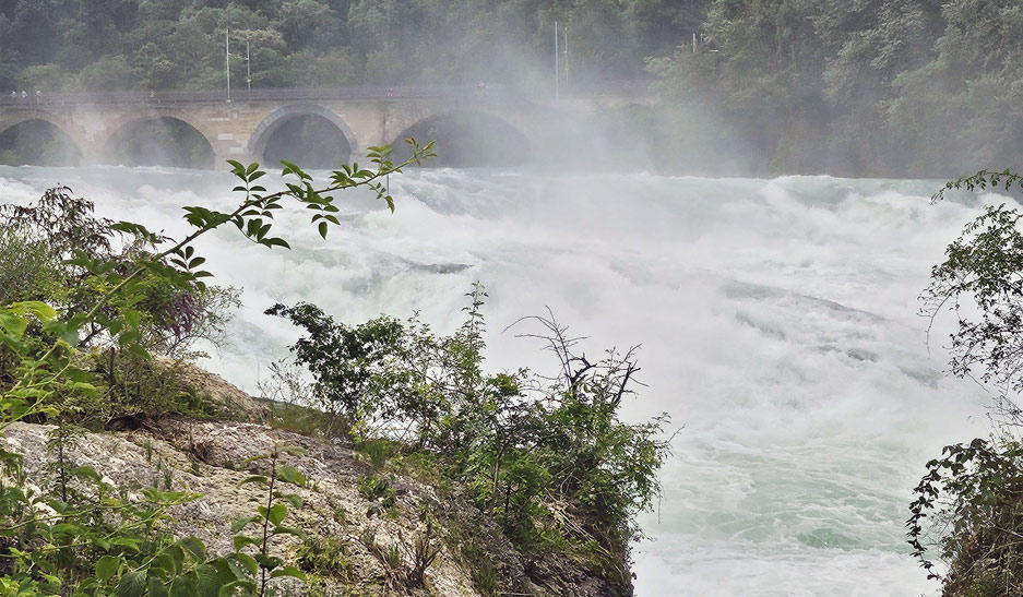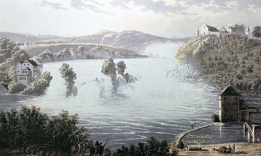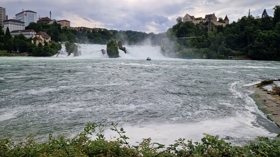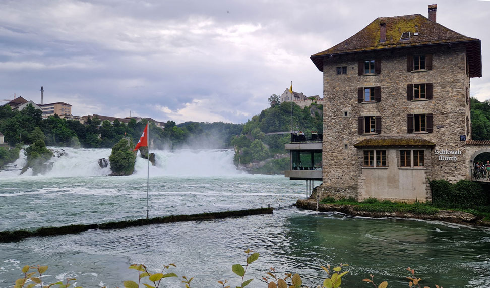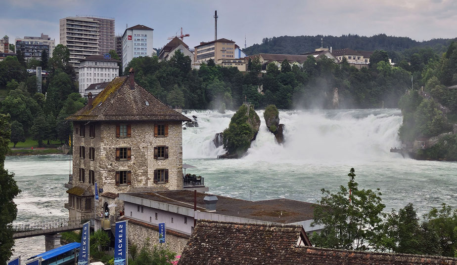 Las cataratas del Rin han impresionado a los turistas durante siglos. La comunidad más cercana es Neuhausen am Rheinfall, donde los turistas pueden ver el castillo de Wörth (del siglo XII). Se puede hacer una excursión en barco por el Rin hasta las cataratas y la Rheinfallfelsen. También hay plataformas de observación con una vista espectacular de las cataratas construidas a ambos lados del Rin, a las que se llega a través de escaleras empinadas y estrechas.