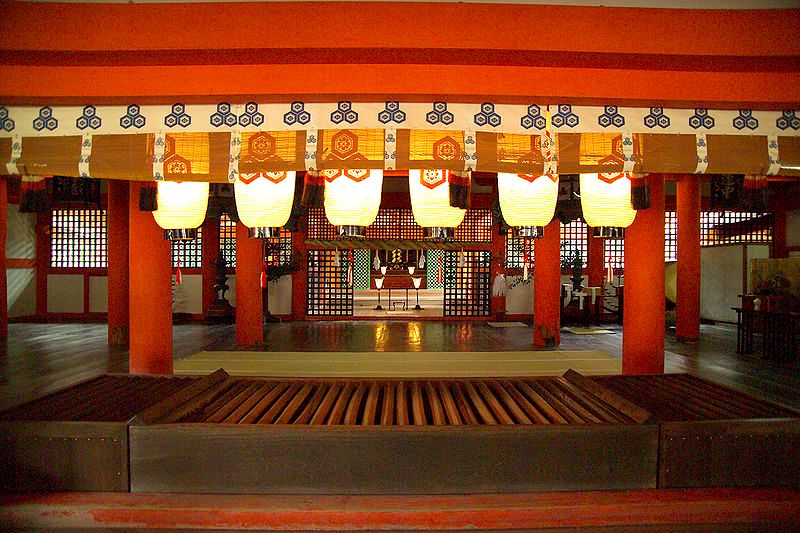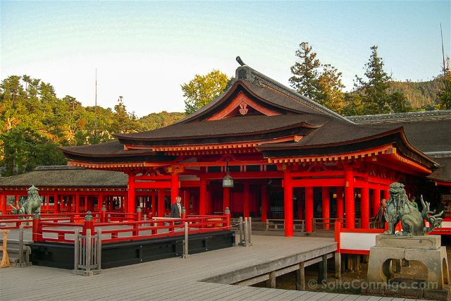 El primer santuario de Itsukushima se estableció en la isla en el año 593. Los edificios eran, como son ahora, de madera y los incendios fueron los culpables de que los actuales daten del siglo XII. Eso sí, como pudimos ver mientras estábamos allí, las tareas de mantenimiento se hacen siguiendo las técnicas antiguas… aunque las brochas con que pintaban eran bastante modernas.
